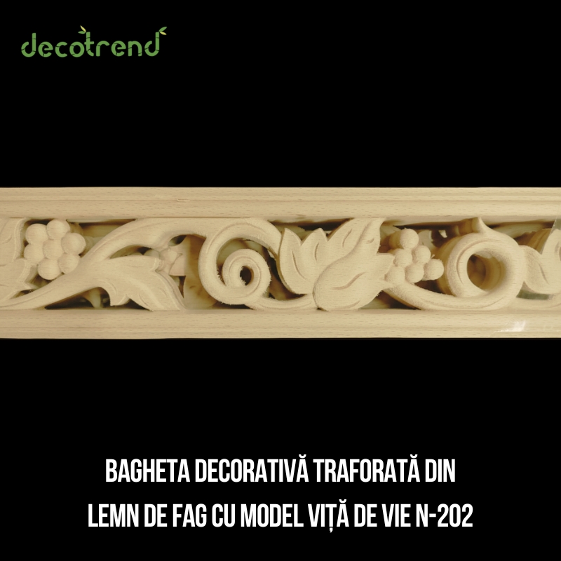 Descoperă frumusețea inegalabilă a naturii transpusă în lemn cu această bagheta decorativă traforată cu model viță de vie, o piesă de excepție care combină artizanatul tradițional cu designul organic inspirat din natură. Motivul delicat de viță de vie cu frunze și mlădițe creează un efect vizual captivant, aducând căldură, eleganță și o notă romantică oricărui spațiu interior.