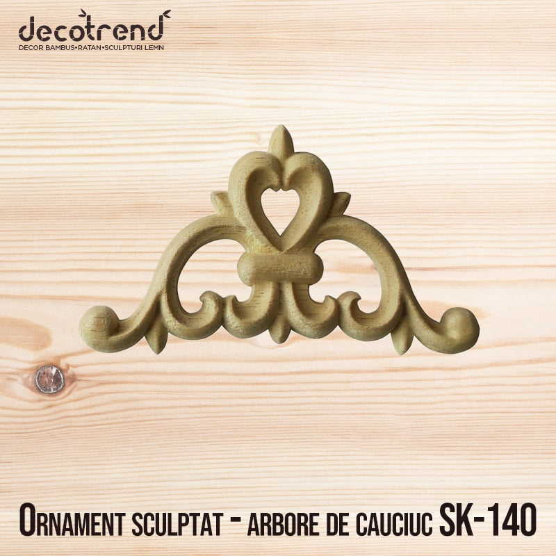 Ornament de colt din lemn de arbore de cauciuc, model cu goluri. Ideal pentru decorarea oricarui tip de mobilier. Este totodata sculptura preferata pentru ornarea tabliilor de usi in combinatie cu sipci , baghete din lemn. Disponibil in trei dimensiuni. Toate sculpturile din lemn sunt prelucrate profesional si se comercializeaza in stare naturala, finisate pentru a fi vopsite si lacuite. Se pot vopsi si lacui cu orice de tip de lac sau vopsea.